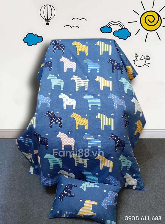Chăn bé đi học hình thú có họa tiết những chú ngựa nhỏ ngộ nghĩnh dễ thương, trên nền màu tím than các bé yêu thích. Chăn mền cho bé mầm non tiểu học của Fami88 sử dụng chất liệu cotton sateen sợi thiên nhiên mềm mịn, an toàn và tạo cảm giác dễ chịu chon các bé khi sử dụng. Chăn được thiết kế nhỏ gọn theo qui chuẩn các trường mầm non mẫu giáo tiểu học tại Hà Nội, TpHCM.