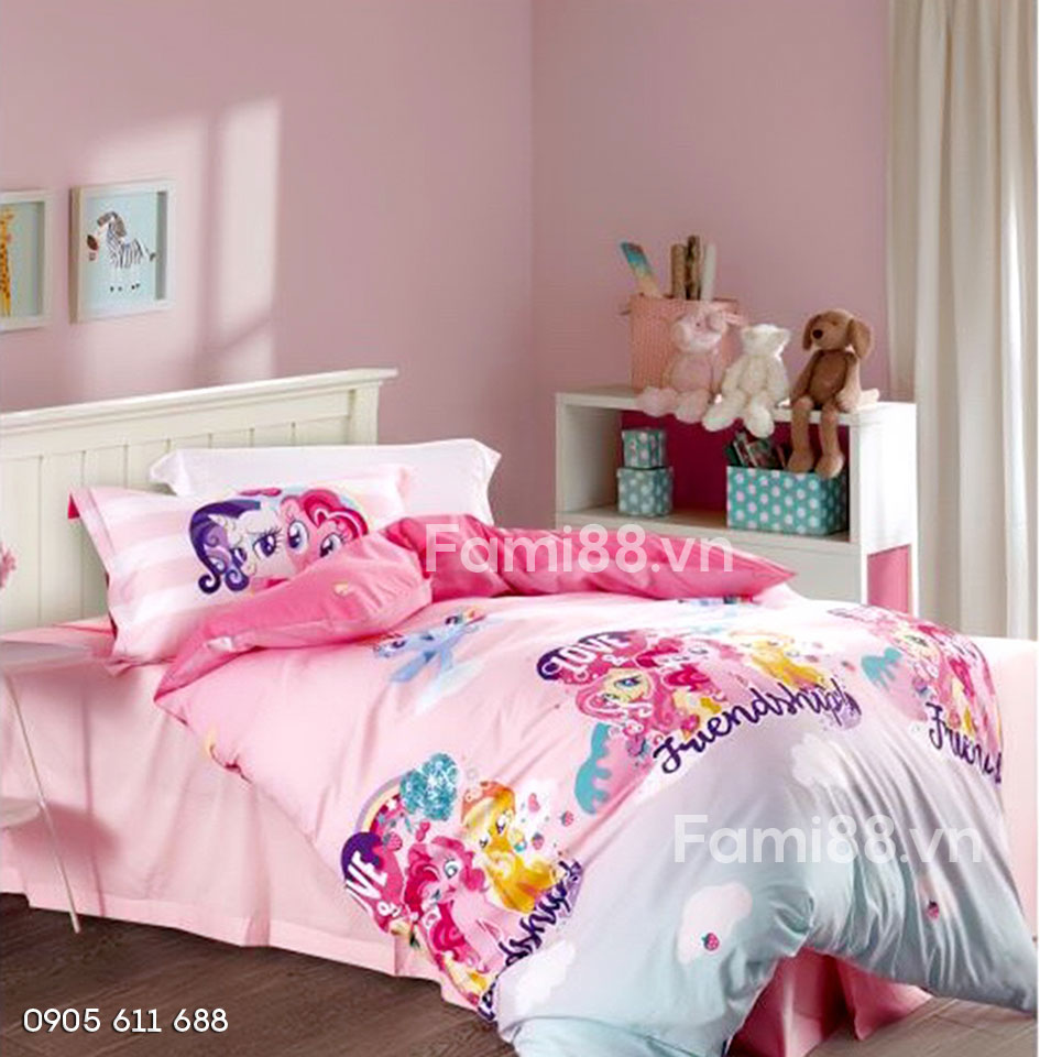 Chăn ga gối đệm ngựa Pony một mẫu chăn ga tuyệt đẹp trong bộ sưu tập chăn ga gối cho bé gái tại Fami88. Bộ sản phẩm sử dụng vải cotton 100% sợi thiên nhiên cao cấp, mềm mịn, thoáng mát, thấm hút, tốt cho làn nhạy cảm của các bé. Thật tuyệt khi dùng trang trí phòng ngủ các bé gái và các bạn yêu thích nhân vật hoạt hình dễ thương này.