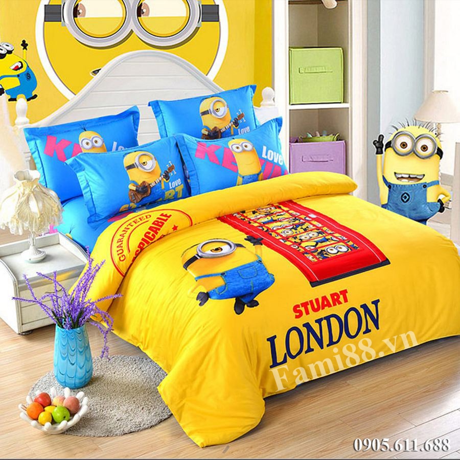 Nếu bạn có ý tưởng trang trí phòng ngủ cho bé yêu theo phong cách Minion, thì bộ chăn ga gối Minion là không thể thiếu trong căn phòng đó. Đối với các bé nhân vật Minion trong phim hoạt hình nổi tiếng Kẻ Cắp Mặt Trăng đã quá quen thuộc. Đặc biệt bộ chăn ga gối Minion là món quà vô giá dành cho các bé là fan hâm mộ Minion. Trên đây là mẫu chăn ga gối hình Minion London đáng yêu dành cho các bé để bố mẹ tham khảo. Ngoài việc chăm lo cho con ăn gì mặc gì thì các mẹ cũng đừng quên chăm sóc nhu cầu ngủ nghỉ của các con nhé.!