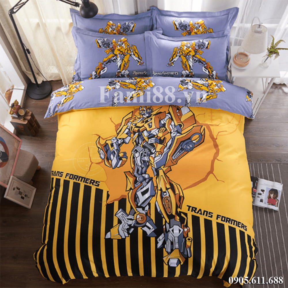 Fami88.vn chuyên cung cấp các mẫu chăn ga gối hình siêu nhân. Chăn ga gối người máy Trans Formers. Chất liệu đẹp cotton 100%, với hình hành 3D là các siêu nhân mà các bé vô cùng yêu thích.