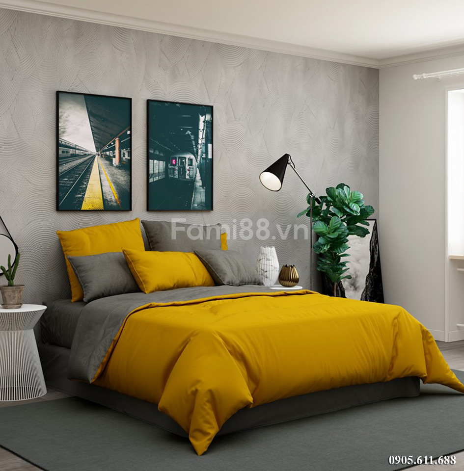 Phong cách bộ chăn ga phối màu vàng ghi nổi tiếng với việc sử dụng các gam màu đơn sắc, cơ bản nhất trong thiết kế. Bộ chăn ga phối màu giữa màu ghi xám – màu vàng là điểm nhấn cho không gian căn phòng có vẻ sâu hơn, làm cân bằng không gian ấm cúng bên trong phòng ngủ.