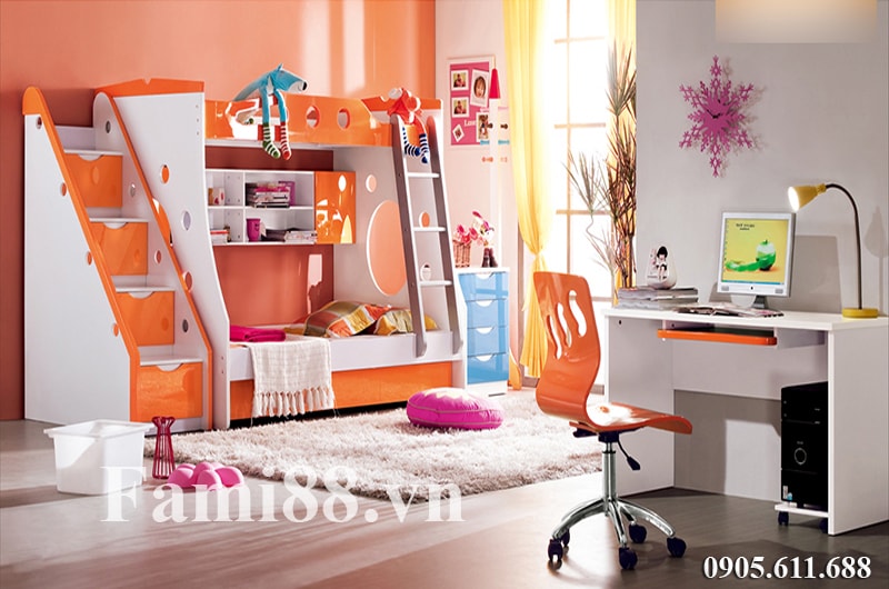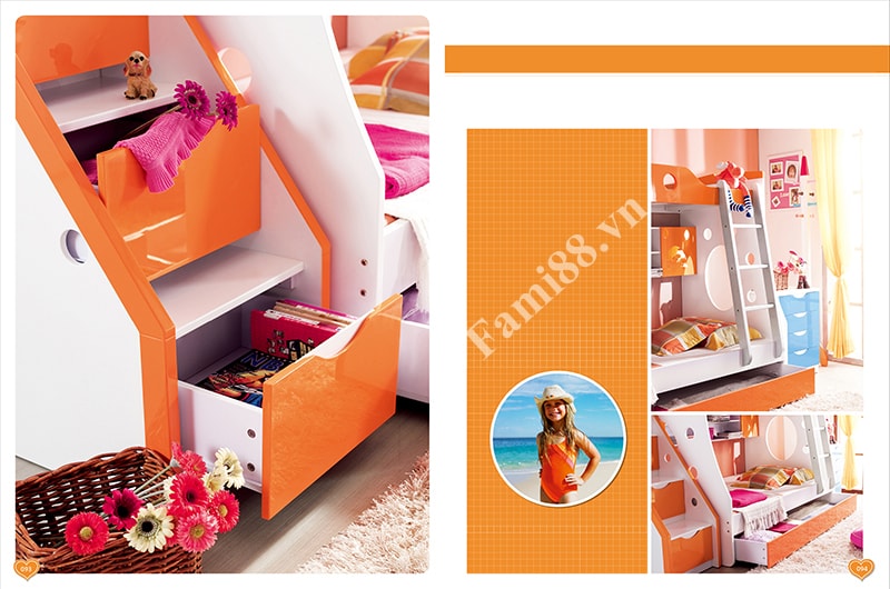 – Với giường tầng cầu thang rời màu cam, bé yêu của bạn sẽ được sống trong 1 không gian sinh động thoải mái dễ chịu & từ đó khơi dậy sự phát triển toàn diện, sự sáng tạo, phát huy tính tự lập, tự tin của bé gái.
