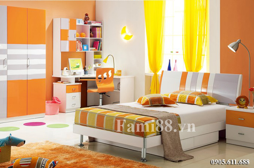Phòng ngủ bé trai bé gái tông cam phù hợp cá tính và sở thích của bé từ màu sắc đến hình thức tạo cho bé sự đam mê trong học tập và hạnh phúc trong vui chơi sinh hoạt. Có được bộ phòng ngủ đồng bộ tông cam, bé yêu của bạn sẽ được sống trong 1 không gian sinh động thoải mái dễ chịu và từ đó khơi dậy sự phát triển toàn diện, sự sáng tạo, phát huy tính tự lập, tự tin của bé.